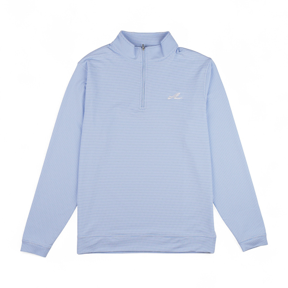 The Sea Ray Peter Millar 1/4 Zip in Cottage Blue combines classic style with modern performance. Crafted from a premium stretch French terry fabric, this pullover offers four-way stretch, moisture-wicking technology, and easy-care convenience for lasting comfort. A mock collar, banded cuffs, and hem deliver a clean finish, while the embroidered Sea Ray logo adds a signature touch of nautical pride. Designed for versatility, it’s the perfect layer for the golf course, boat deck, or casual weekends.