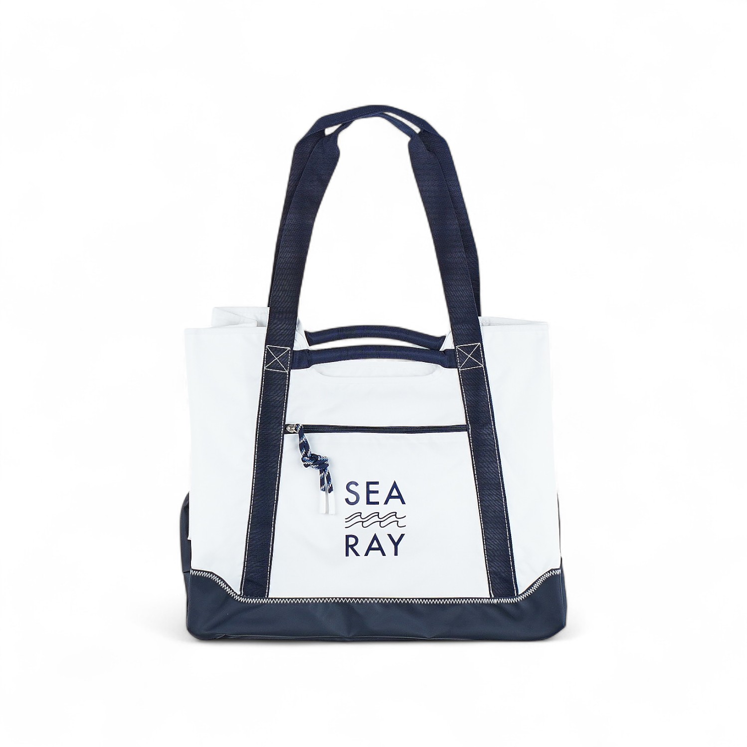 A classic with a nautical twist, the Sea Ray Suncrest Tote is your ultimate oversized carryall—built for style, function, and adventure. Featuring a spacious main compartment, interior and exterior zippered pockets, and a boating-inspired cord zipper puller, this tote blends coastal style with serious utility. The water-resistant TPU-coated bottom and durable nylon/poly fabric make it ideal for boat days, beach trips, or everyday errands.